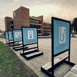 At the time of writing, the exhibition has been in Durham for a few weeks. The frames and bases are manufactured from aluminium and powder coated, the bottom of each frame is a tray. In winter, when the winds are high, and the rain falls incessantly, concrete slabs are used to support stability. During the summer months these can be removed and plants planted, giving them a very different softer look.